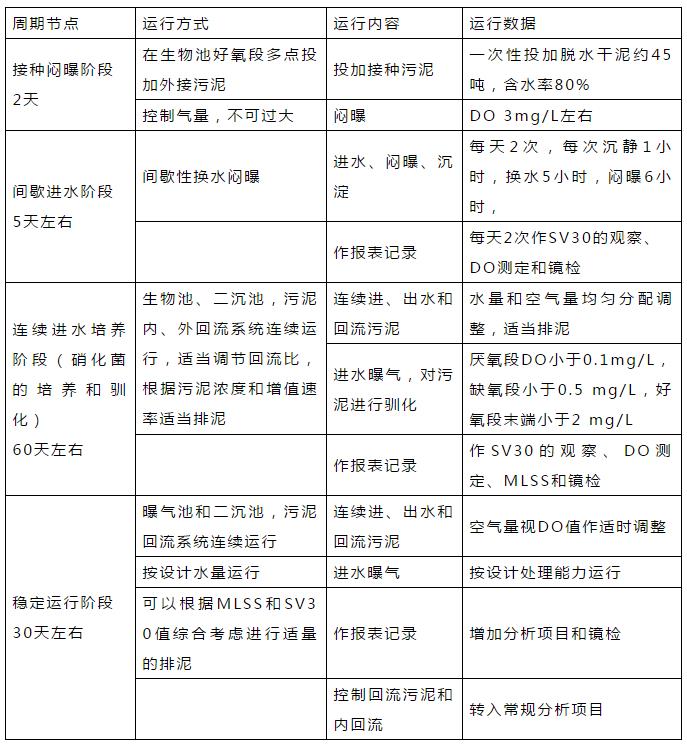 此時全面確定各項(xiàng)工藝參數(shù),以工藝參數(shù)作為實(shí)際運(yùn)行指導(dǎo),根據(jù)實(shí)際進(jìn)水水量和水質(zhì)情況來來確定合適的工藝控制參數(shù),以保證運(yùn)行的正常進(jìn)行和使出水水質(zhì)達(dá)標(biāo)的的同時盡可能降低能耗。并通過馴化實(shí)現(xiàn)使硝化菌與聚磷菌共存的生態(tài)系統(tǒng)達(dá)到平衡,確保出水水質(zhì)。