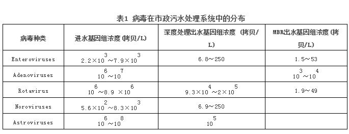 一旦病毒從宿主細胞中釋放出來,它們就會暴露在各種物理、化學和生物等環境因素中,如同生物大分子一樣存在,在這些環境因素中,物理、化學和生物因素均起到了重要的作用,隨著市政污水處理廠處理流程的推進,病毒數量呈顯著的降低趨勢,最終出水中病毒的分布呈現對數正態關系[16]。表1列舉了一些市政污水處理系統的進水和出水中病毒的分布情況[17-20]。