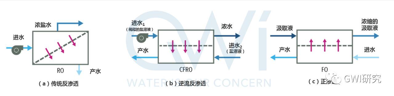 常見的標(biāo)準(zhǔn)RO、逆流RO和正滲透FO三者的滲透原理區(qū)別如下圖所示。而這兩項技術(shù)則是通過利用不同滲透壓(正滲透與反滲透)的原理,在反滲透膜出水端添加少量鹽溶液,以維持RO膜進料端和滲透端的鹽水濃度,從而有效降低膜兩側(cè)的壓力差。通過這一新興的鹽濃縮蒸發(fā)設(shè)備和多級串聯(lián)的處理,出水濃度可高達(dá)250,000 mg/L TDS。這樣一來,系統(tǒng)在進行濃縮的同時,其所消耗的外加壓力也相應(yīng)降低,同時實現(xiàn)了節(jié)能的目的。