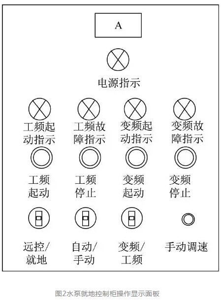 清凈水泵就地控制柜操作顯示面板如圖2所示。水泵工頻運(yùn)行時(shí)“工頻起動(dòng)指示燈”點(diǎn)亮,工頻故障時(shí)“工頻故障指示燈”點(diǎn)亮;水泵變頻運(yùn)行時(shí)“變頻起動(dòng)指示燈”點(diǎn)亮,變頻故障時(shí)“變頻故障指示燈”點(diǎn)亮。
